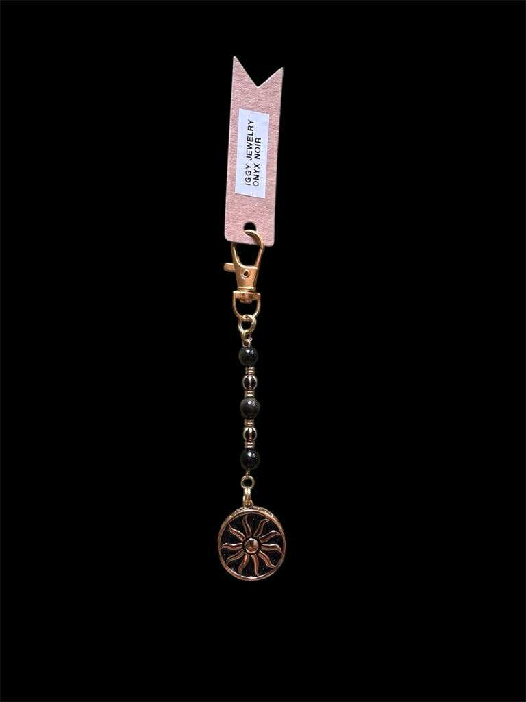 Éclat et confiance : onyx et soleil doré* Ce bijou de sac doré associe des billes d’onyx, pierre de protection et de force intérieur, à une breloque représentant un soleil doré sur un fond noir, symbole de lumière, d’optimisme et de rayonnement personnel. Un accessoire chic et symbolique pour illuminer votre quotidien