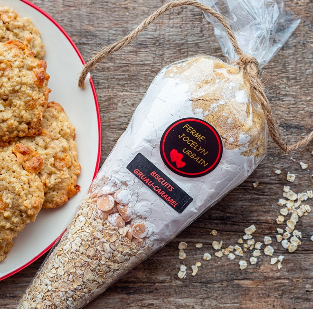 Biscuits tendres au gruau et chocolat caramel délicieux à chaque bouchée ! Excellent servi chaud accompagné un bon café ! Nos desserts sont tellement simples et faciles à faire, vous cherchez une activité à faire avec vos enfants et voilà ! Valorisation et fierté assuré ! Vous cherchez un cadeau original à donner en cadeau à Noël, Saint-Valentin, un anniversaire, à Pâques, en cadeau d’hôtesse, de professeur, à vos employés ou tout autre personne dont vous voulez faire plaisir, un cadeau alimentaire toujours apprécié ! Possibilité de portionner et de congeler. Bon appétit !